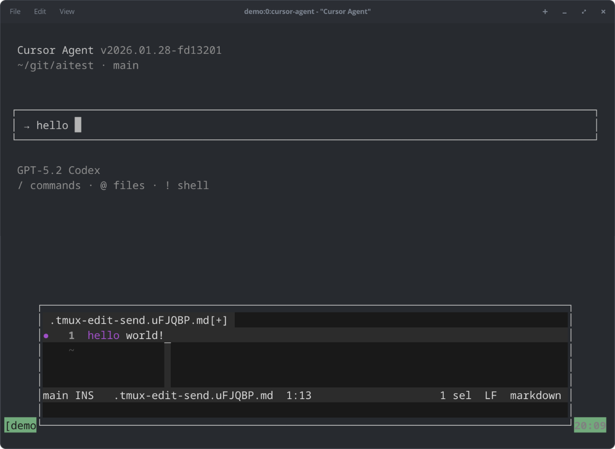 Although I use Helix, this is just $EDITOR. If you prefer Vim, Neovim, or something more exotic, it should work. The same mechanism can be used to feed text into any TUI that reads from a terminal pane, not just Cursor Agent.