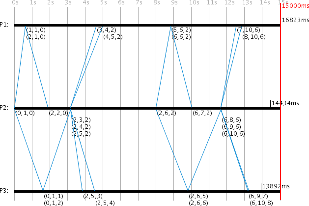 Because P3 starts a new request before receiving the answer to its previous one, and because it always associates server responses with its most recently sent request, its RTT calculations become incorrect on each round, and its local time is poorly synchronized. P1 synchronizes to 21446ms (error: -1446ms) while P3 only reaches 16557ms (error: -3443ms).